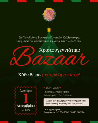 Ένα από τα ωραιότερα και πιο επιτυχημένα bazaar των Χριστουγέννων, αυτό του Πανελλήνιου Σωματείου Γυναικών «Καλλιπάτειρα», θα λάβει χώρα τη Δευτέρα 1 Δεκεμβρίου στο ξενοδοχείο Theoxenia Palace στην Κηφισιά. Είστε όλοι καλεσμένοι για να μοιραστούμε παρέα τη μαγεία των Χριστουγέννων και να αγοράσουμε τα δώρα των γιορτών για τους αγαπημένους μας, ενισχύοντας ταυτόχρονα τους σκοπούς του συλλόγου