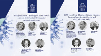 Τα διαχρονικά μηνύματα της Ναυμαχίας της Σαλαμίνας και της Μάχης των Θερμοπυλών, σε μια κρίσιμη για την ανθρωπότητα περίοδο, συζήτησαν στο πλαίσιο του 5ου Delphi Economic Forum η Πρέσβης Καλής Θελήσεως της UNESCO και Πρόεδρος της Τιμητικής Κοσμητείας του Επετειακού Έτους «Θερμοπύλες-Σαλαμίνα 2020» Μαριάννα Βαρδινογιάννη και η Πρύτανης της Σορβόννης Ελένη Αρβελέρ.